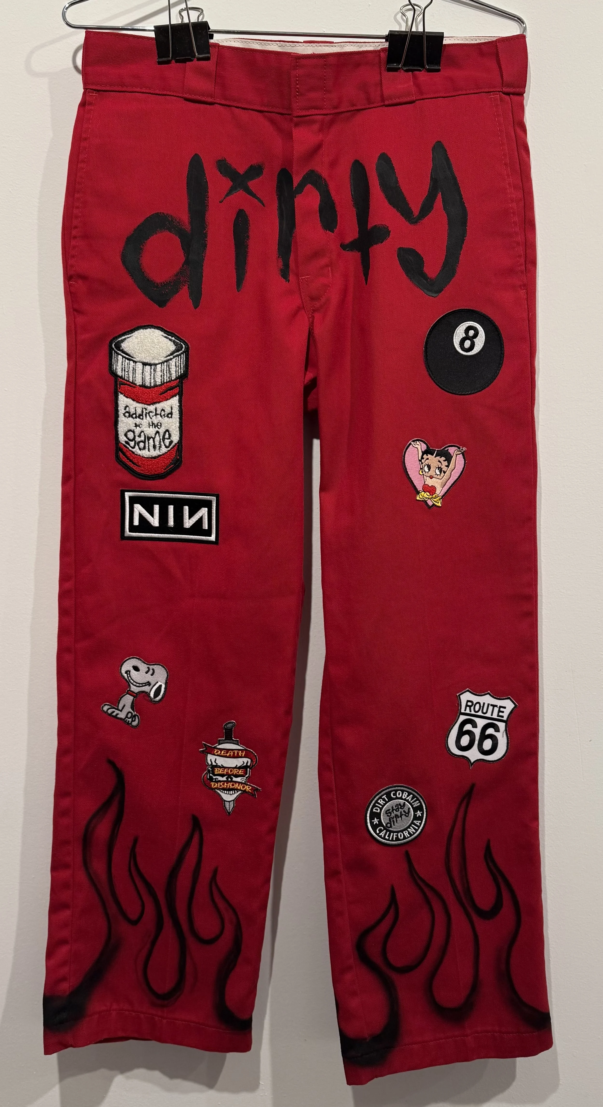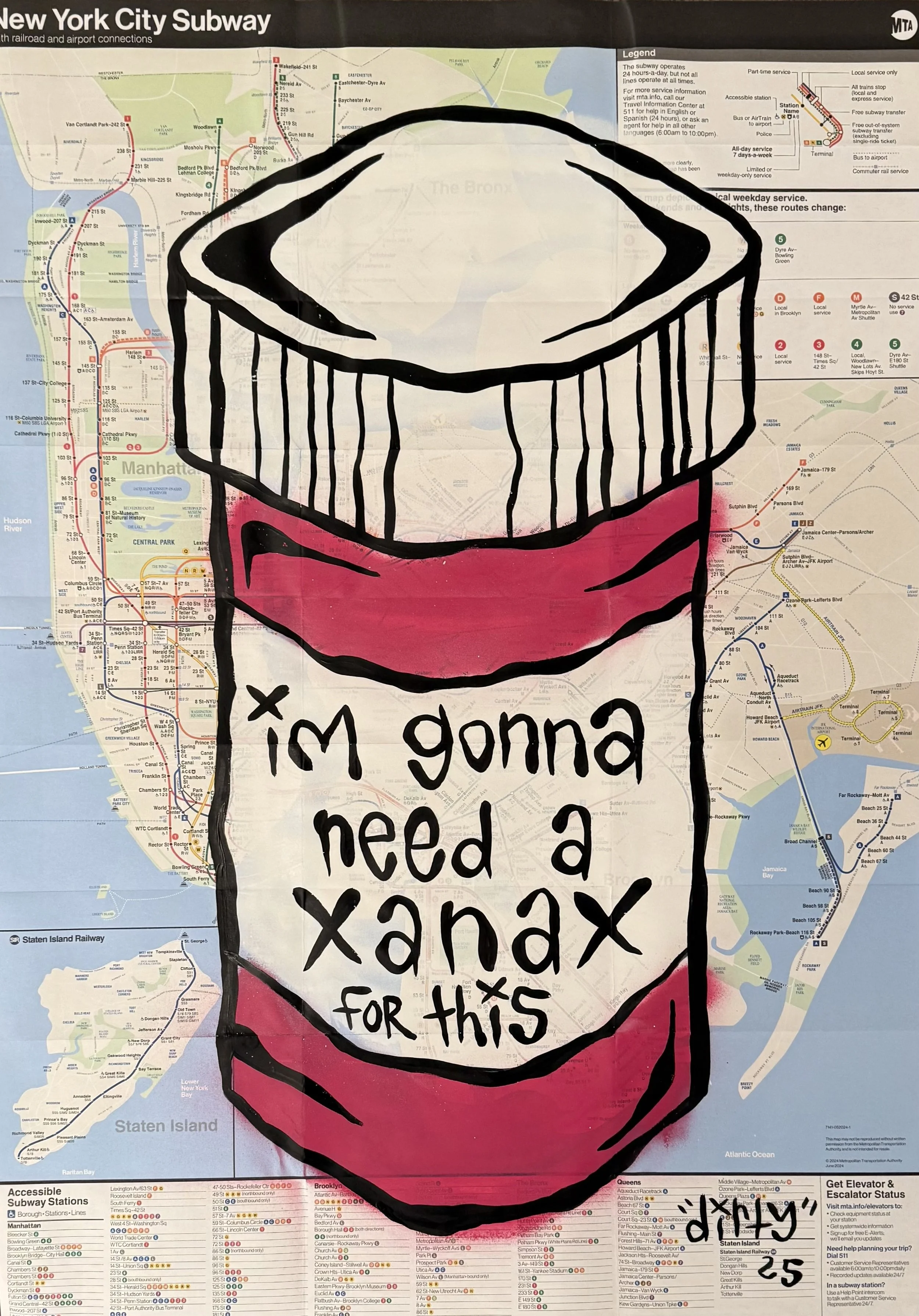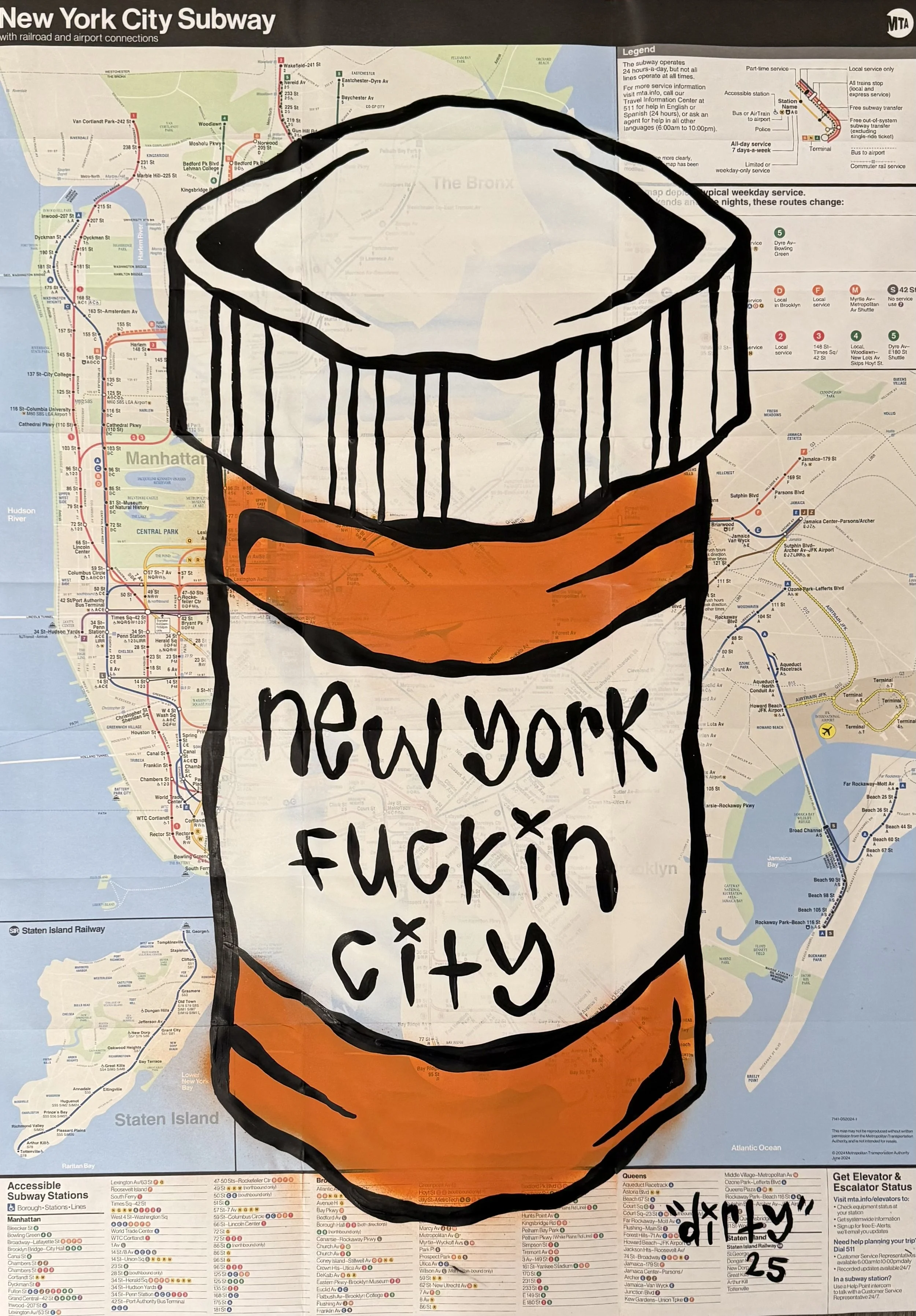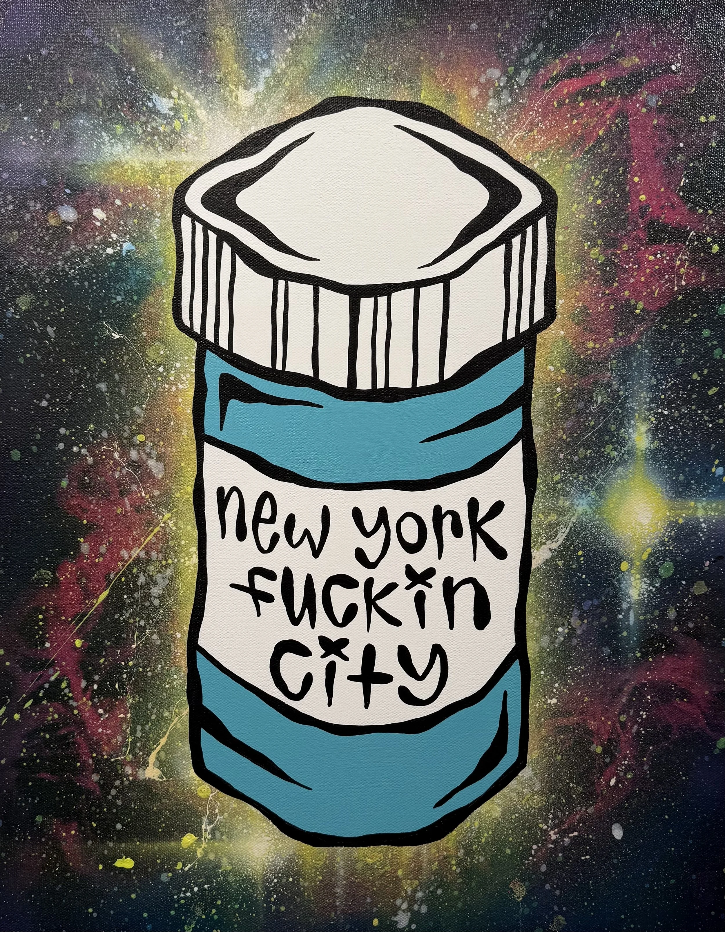 dirtcobain’s work transforms personal struggle into bold public imagery. The California native began sketching pill bottles during rehab in 2014—symbols that became his defining motif. Paired with slogans like “U Get Me So High”and “I’m Gonna Need a Xanax for This,” his art blends dark humor with raw honesty about addiction, resilience, and survival. Expanding from canvases to fashion, dirt has collaborated with brands like Doc Martens and Alice + Olivia, even appearing in New York Fashion Week. His work insists that both art and style are forms of self-expression.